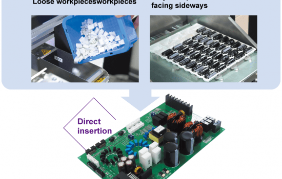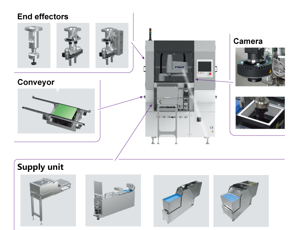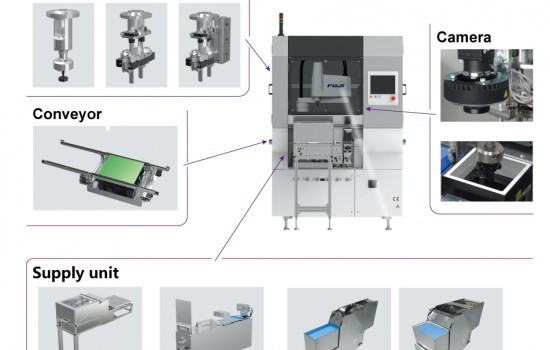 Conventional dedicated machines, such as inserters, require repackaging into dedicated trays in the supply process. With SW-BA, it is possible to supply parts in the same packaging as they came in by using Robot Cell Kits such as the loose workpiece feeders and tray conveyance unit, as well as the Fuji developed, highly versatile vision processing system.