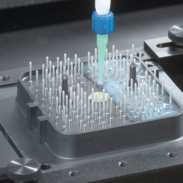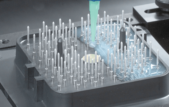 Surface Mount Adhesive (SMA), solder paste, and filled epoxies require accurate deposits to adhere SMT components to a PCB surface. Consistent dot or bead profiles are critical for bonding a broad range of components with a growing emphasis on miniaturization that is achievable with jetting valves or auger pumps.