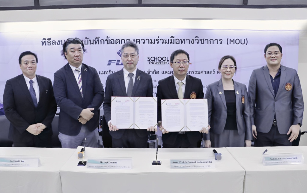 The signing ceremony was attended by Mr. Joji Isozumi, President & CEO of Fuji Corporation; Mr. Jun Sasaki, Managing Director of Fuji Machine Asia (FMA); and Mr. C.K. Sun, General Manager of Fuji Machine (Thailand) Co., Ltd. (FMT). Representing KMITL were Assoc. Prof. Dr. Somyot Kiattivanishvily, Dean of the Faculty of Engineering; Prof. Dr. Uma Siboonruang; and Asst. Prof. Kiakkrai Suksud. Witnessing the ceremony were section managers from Fuji Machine Thailand, along with KMITL faculty, lecturers, staff, and students.
